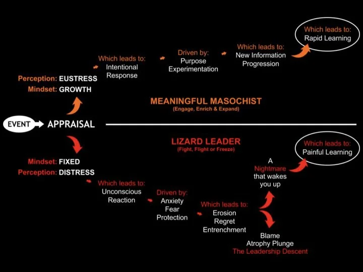Today, this leader still carries that reflex. When feedback comes, even with good intentions, they experience a visceral response marked by defensiveness, withdrawal, and over-explaining. At Level 52, we call this the Lizard Leader (Reactive mode), the part of us wired for survival rather than growth. Their early experiences taught them to associate stress with distress, reinforcing a fixed mindset where safety, not stretch, becomes the goal.
